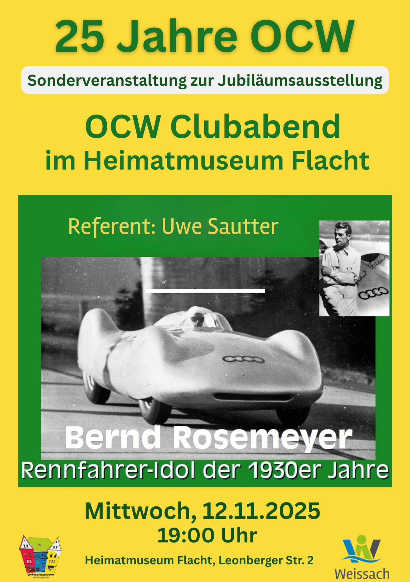 Im Mittelpunkt des Abends steht ein Vortrag von Uwe Sautter über „Bernd Rosemeyer, Rennfahrerlegende der 1930er-Jahre“.